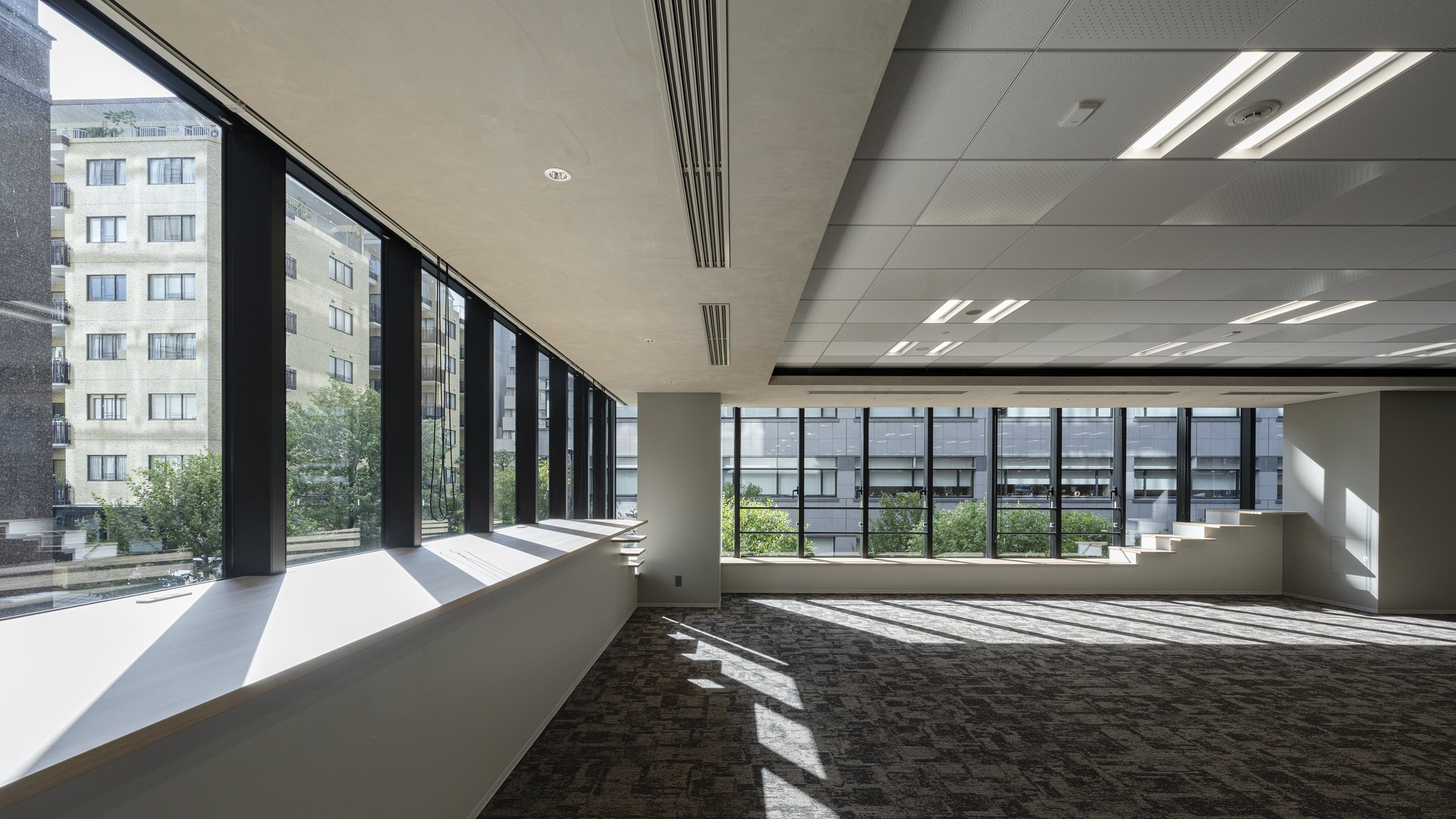 設備面ではすべての事務所空間に空気輻射空調システムや自然換気窓を導入するなど省エネ性能にも優れ、建築物省エネルギー性能表示制度(BELS)で最高評価となる5スターを取得。また人々の健康やウェルネスに着目した国際的なビル評価指標であるWELL認証において、賃貸オフィスビルとしては日本初となる「WELL v2」の予備認証を取得しています。