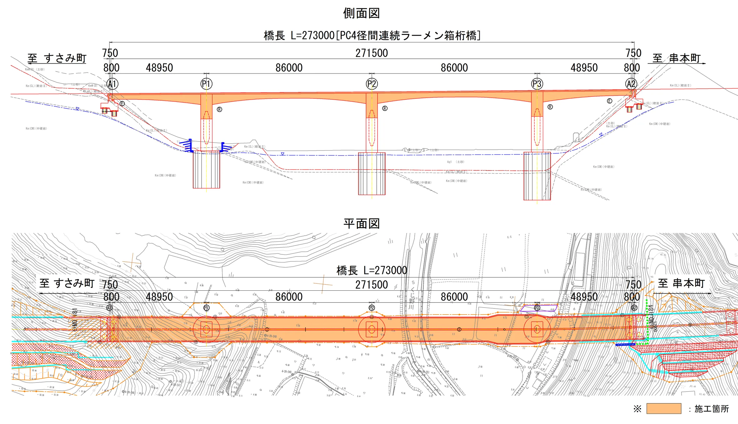 本工事は、すさみ串本道路の和深IC(仮称)~串本IC(仮称)間に位置し、二級河川鬮野川、町道二色くじの川線を跨ぐPC4径間連続ラーメン箱桁橋です。