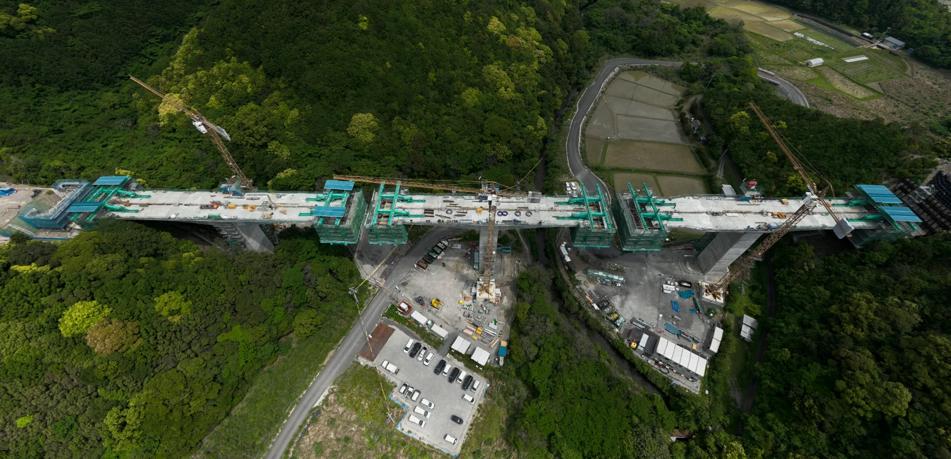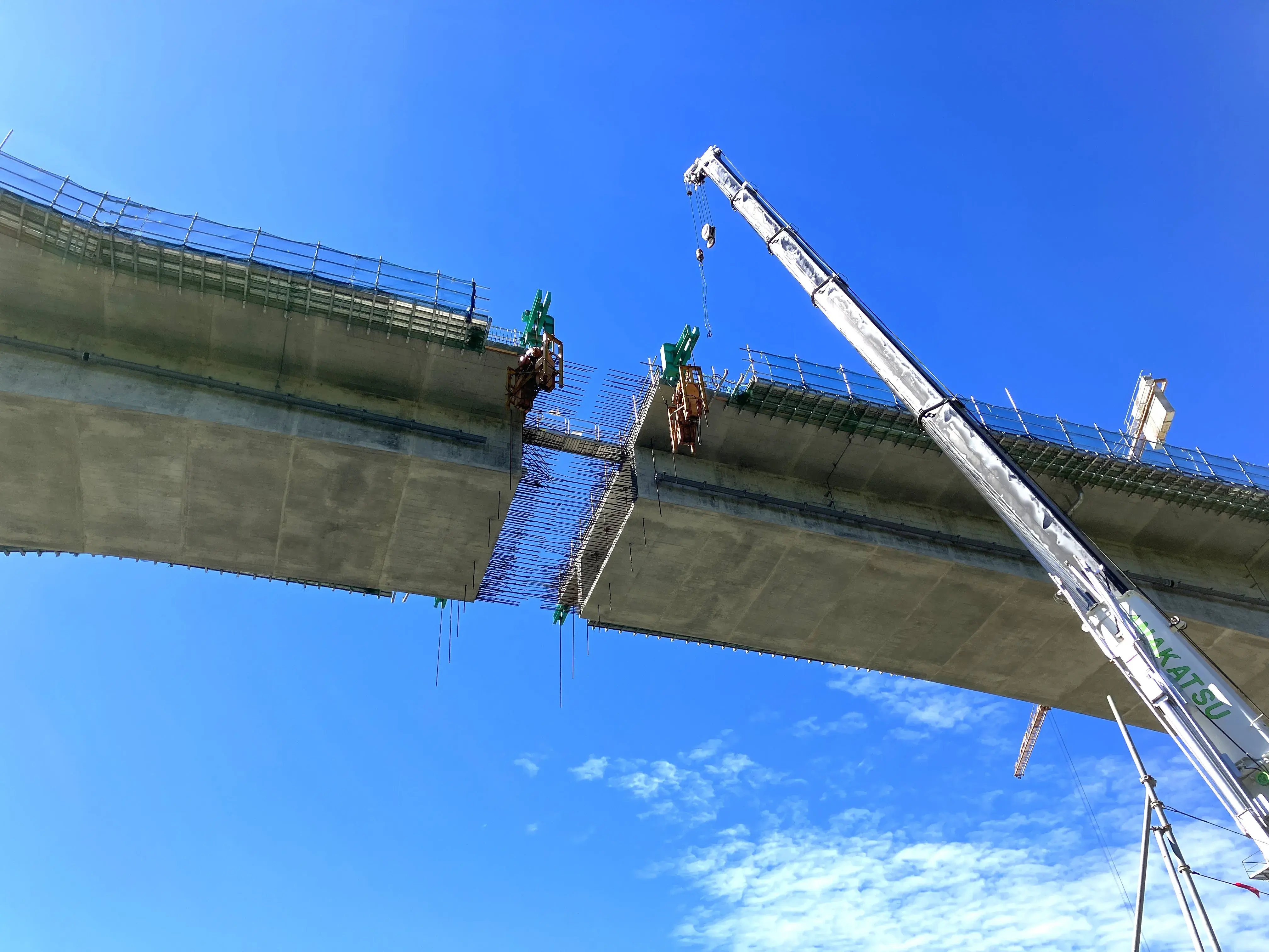 和歌山県で施工中の「鬮野川(くじのがわ)橋上部工工事」では張出し架設工法による桁架設を進め、最大13BLの張出し、中央閉合、側径間閉合を終えて2025年9月に桁が完成しました。