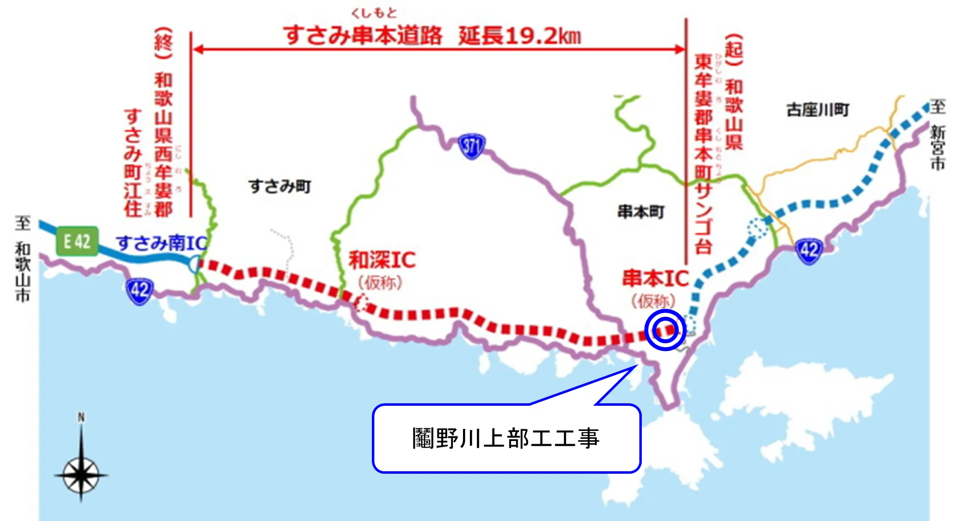 すさみ本串道路(延長19.2km 自動車専用道路)は、国道42号の和歌山県東牟婁郡串本町から西牟婁郡すさみ町間における、異常気象時通行規制区間の解消、防災・災害時の代替路確保等を主な目的として整備が進められています。