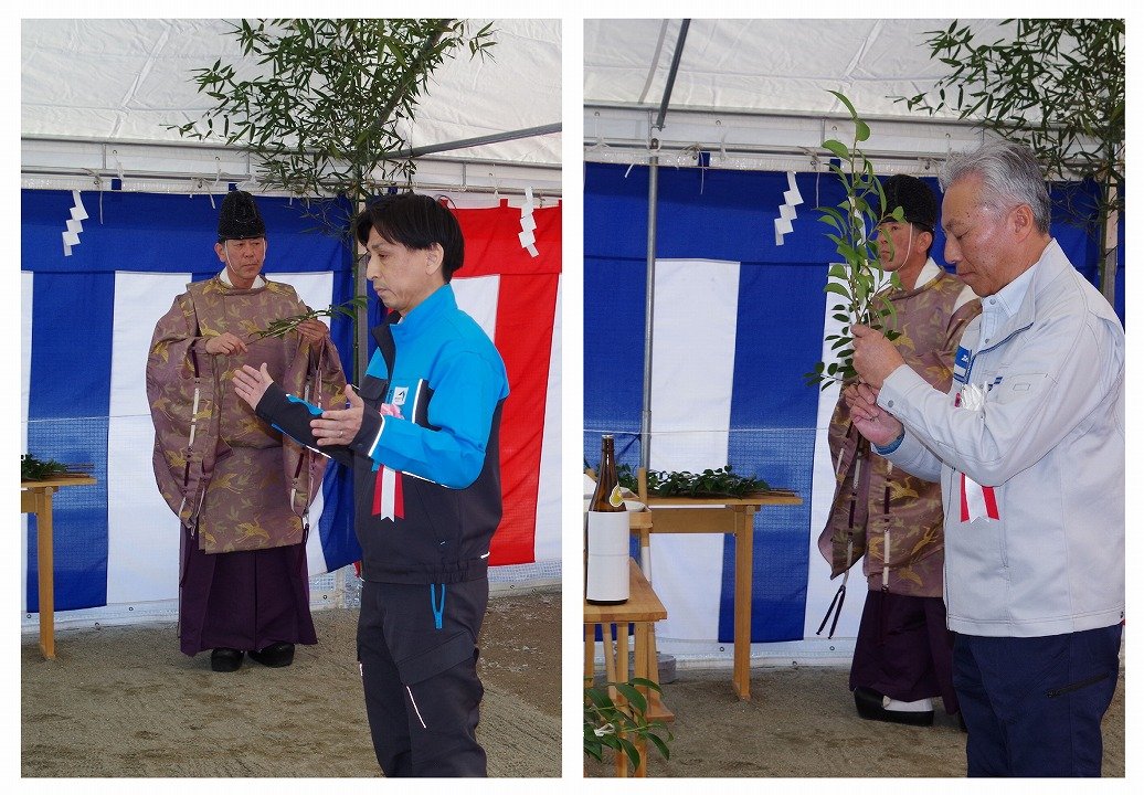 当日は発注者、工事関係者48名が出席しました。神事では錢高組をはじめとする工事関係者による清祓に始まり、西日本高速道路株式会社関西支社の澤村良弘和歌山工事事務所長、当社の松本又吉専務役員大阪支社長が鍬入れの儀を執り行いました。続いて、西日本高速道路株式会社関西支社の西垣祐二和歌山工事事務所田辺工事長をはじめ、当社から松本又吉専務役員大阪支社長、桐木俊之統轄作業所長のほか、協力会社の代表取締役5名が玉串を奉奠し、工事の無事故・無災害、早期完成を祈願しました。