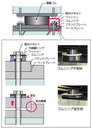 高引抜き対応型免震装置は、ゴムリング、ワッシャー、および内部鋼リングから成る「SWCCリング」と呼ぶ特殊なデバイスを、免震装置の取付けボルトとフランジプレートの間に入れることにより、地震時の免震装置の浮き上がりを許容して積層ゴムに作用する引っ張り力を緩和させるものです。