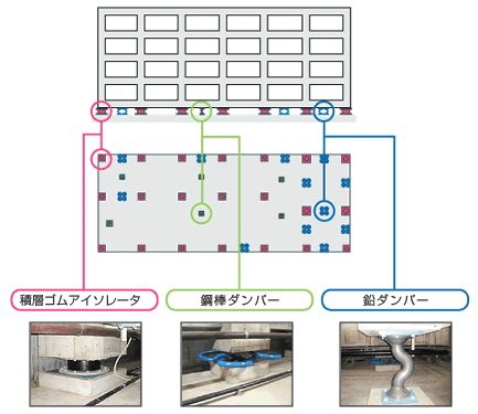 ゴム支承には微小変形から大変形まで安定したバネ性状を持つ天然ゴム系積層ゴムのほか、減衰機能を併せ持つ高減衰積層ゴム、鉛プラグ入り積層ゴムがあります。