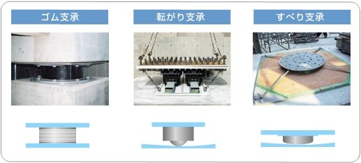 すべり支承、転がり支承は、上部構造と下部構造の水平変位抵抗が小さく、地盤の揺れを建物に伝えにくくします。
