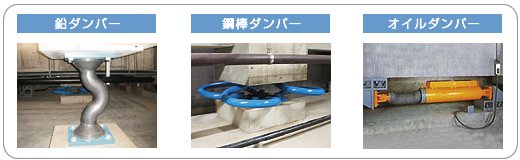 ダンパーは振動エネルギーを吸収し、免震構造に減衰性能を付与して建物と地盤の相対変位を抑制する働きがあります。鋼材を使用した履歴性ダンパー、オイル等を使用した粘性系ダンパー等があります。